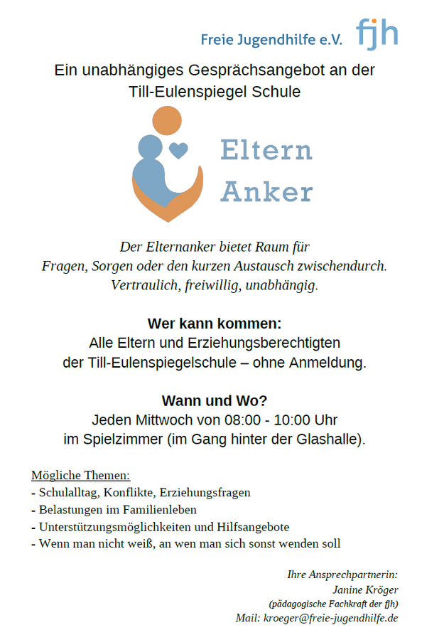 Der Elternanker bietet allen Eltern und Erziehungsberechtigten der Till-Eulenspiegelschule einen Raum für Austausch, Fragen und Unterstützung. Egal ob es um den Schulalltag, Konflikte, Erziehungsfragen oder persönliche Belastungen geht – hier können Anliegen in einem vertraulichen und offenen Rahmen besprochen werden.