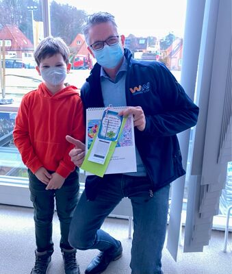 Als kleines Dankeschön übergab Henning im Namen des Schülerparlamentes unseren TES-Schulkalender 2022.