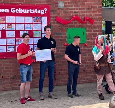 Auf unserem Jubiläums-Schulfest am 10.06.2022 übergeben Mitglieder des Round-Table feierlich eine Spende für unseren Förderverein. Diese nimmt unser Vorsitzender des Fördererkreis Herr Hack entgegen.