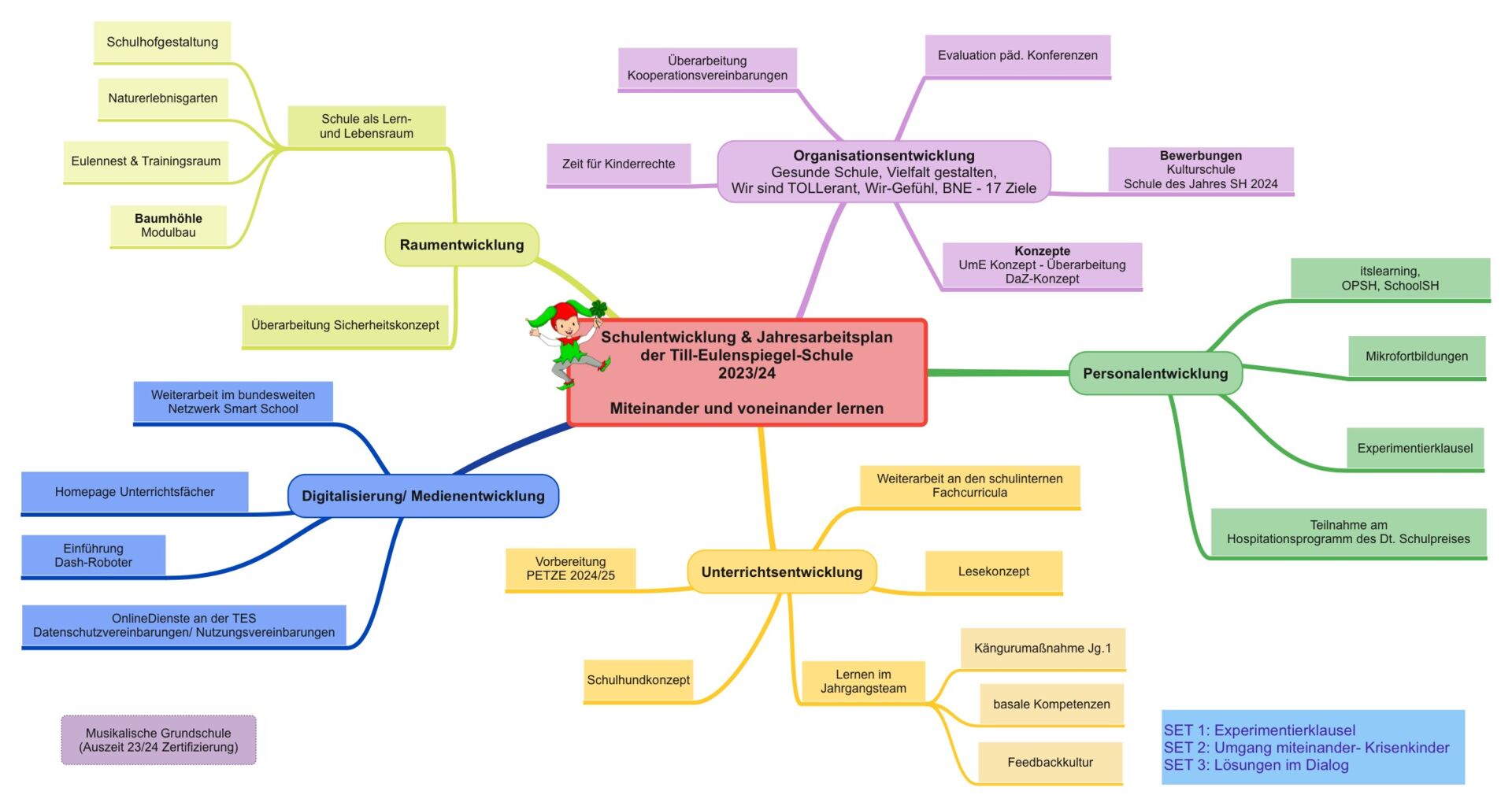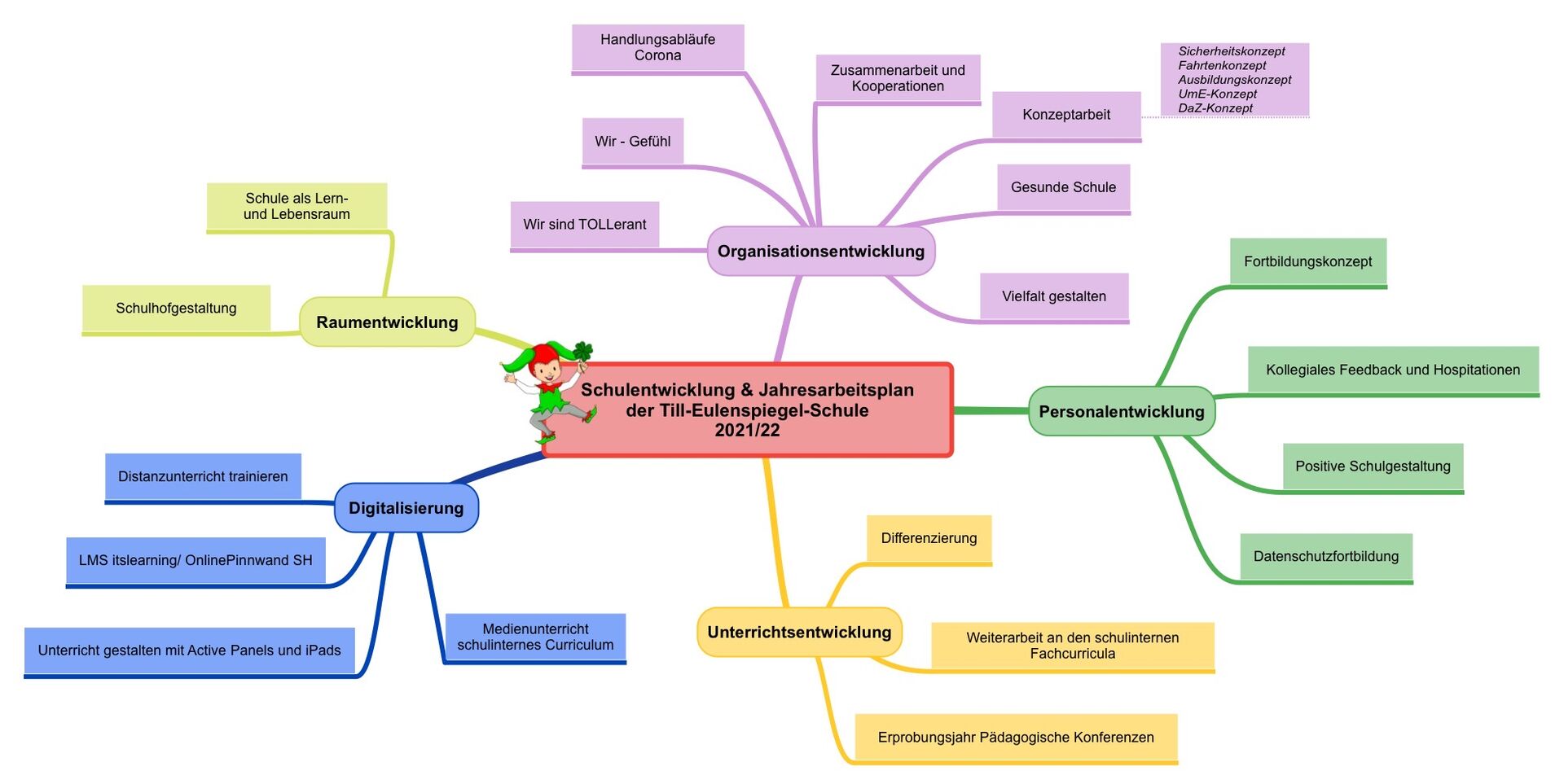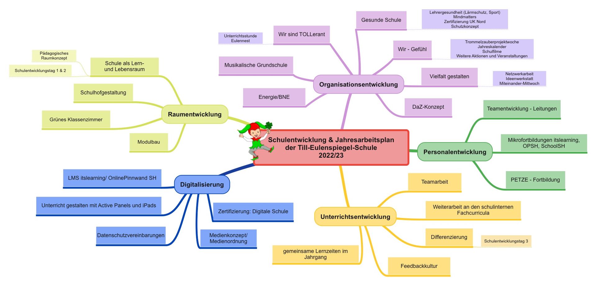 Schulentwicklung an der Till-Eulenspiegel-Schule Unsere Jahresplanarbeit für das Schuljahr 2024/25 zeigt, woran wir in Unterricht, Digitalisierung sowie in der Personal- und Organisationsentwicklung arbeiten, um unsere Schule zukunftsorientiert und gemeinschaftlich weiterzuentwickeln. Rückblick Jahresplanarbeit der TES 2021/22 [JPG, 126,9KB] Jahresplanarbeit der TES 2022/23 [JPEG, 144,7KB] Jahresplanarbeit der TES 2023/24 [JPEG, 149,6KB]